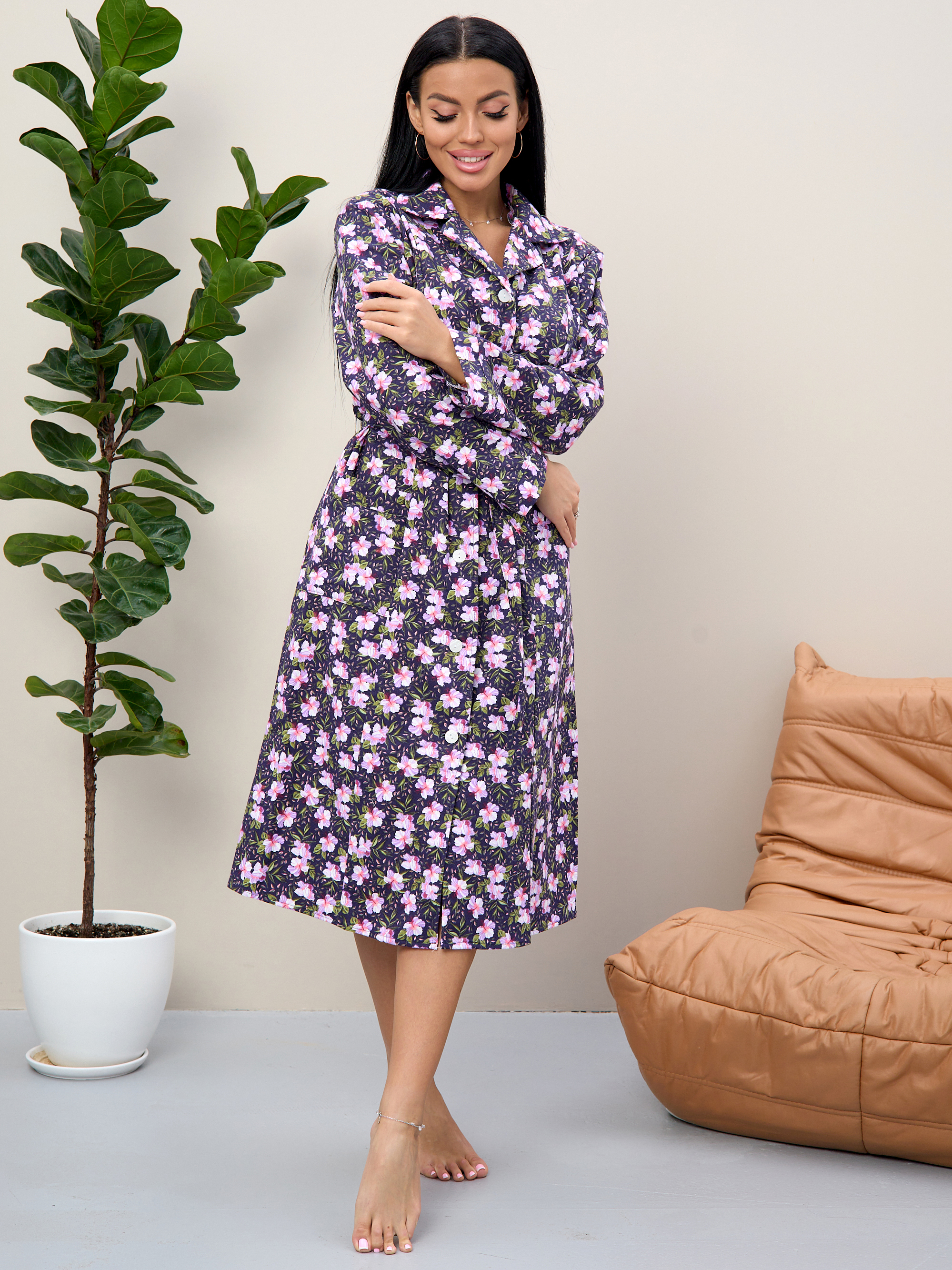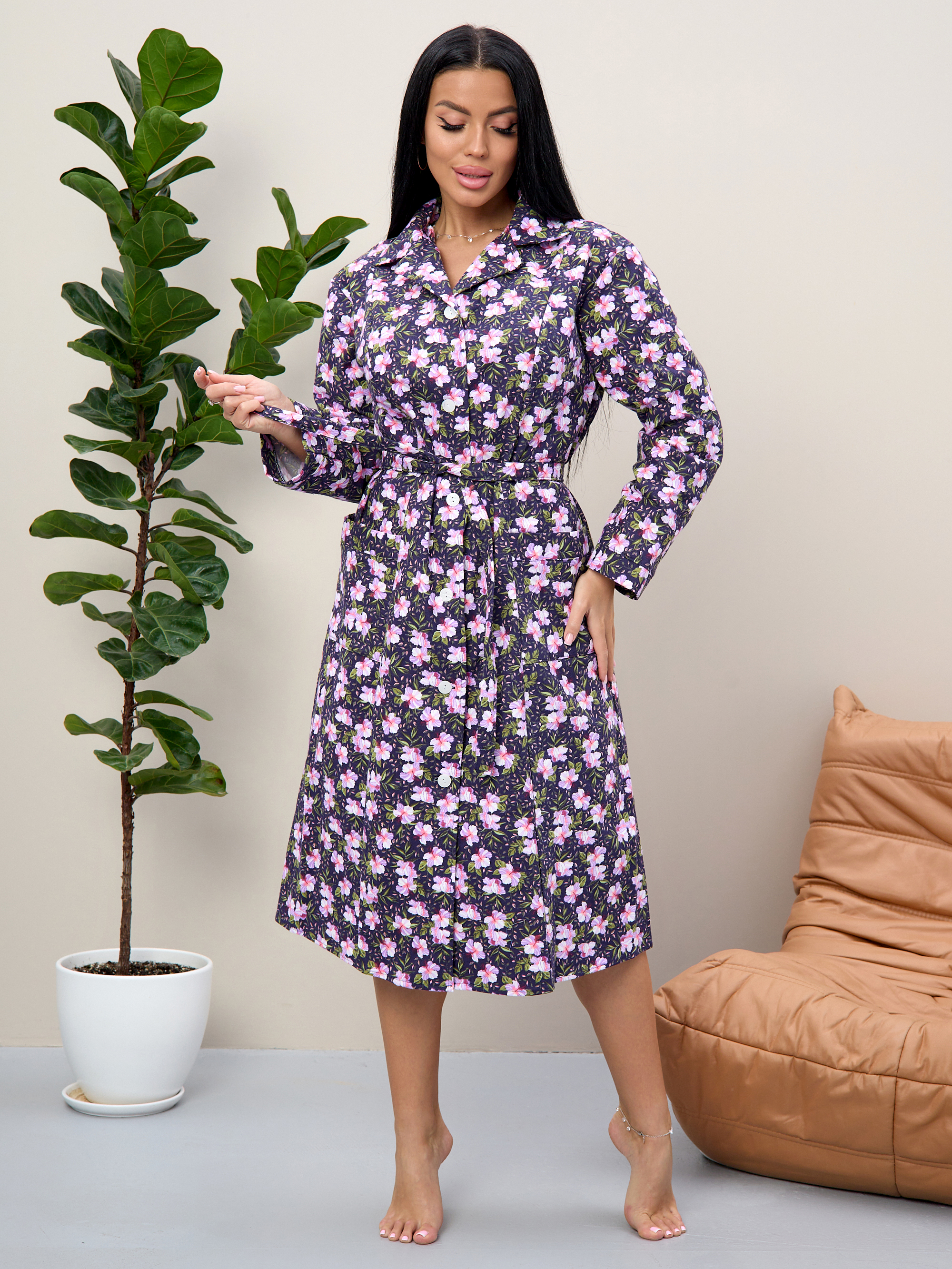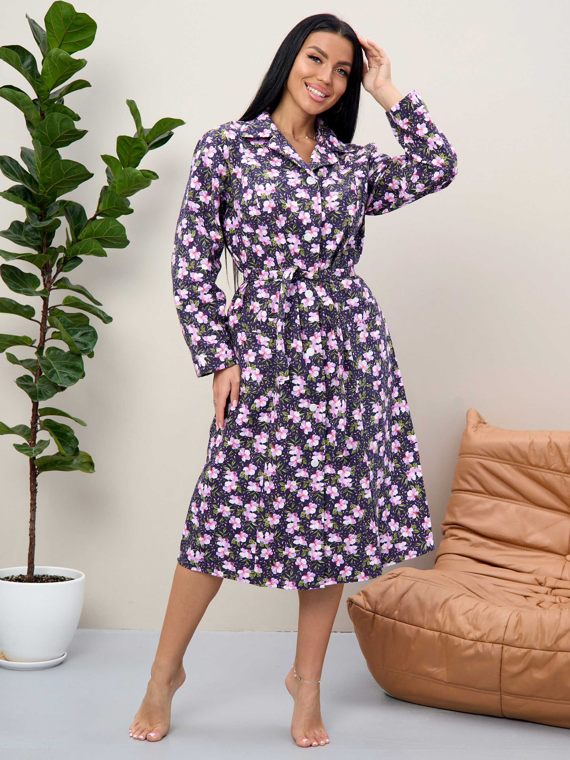 Халат байковый женский с длинным рукавом и накладными карманами на пуговицах.