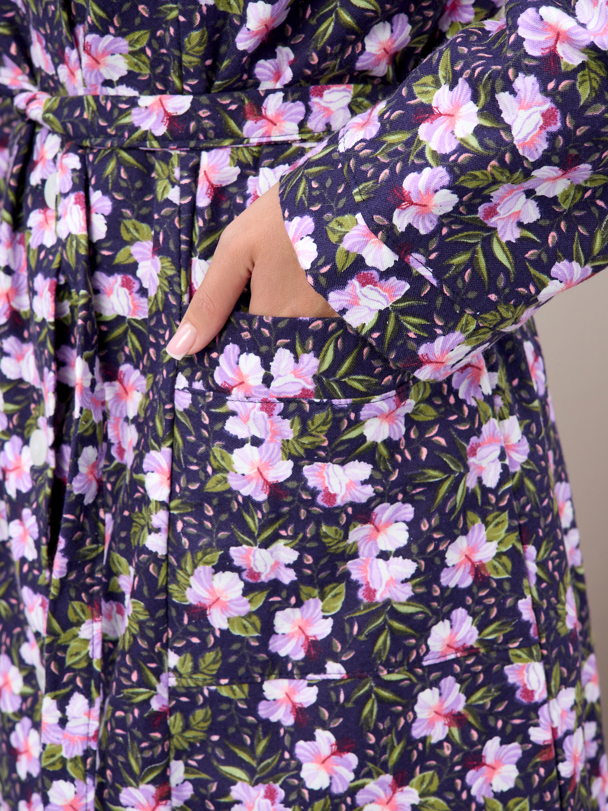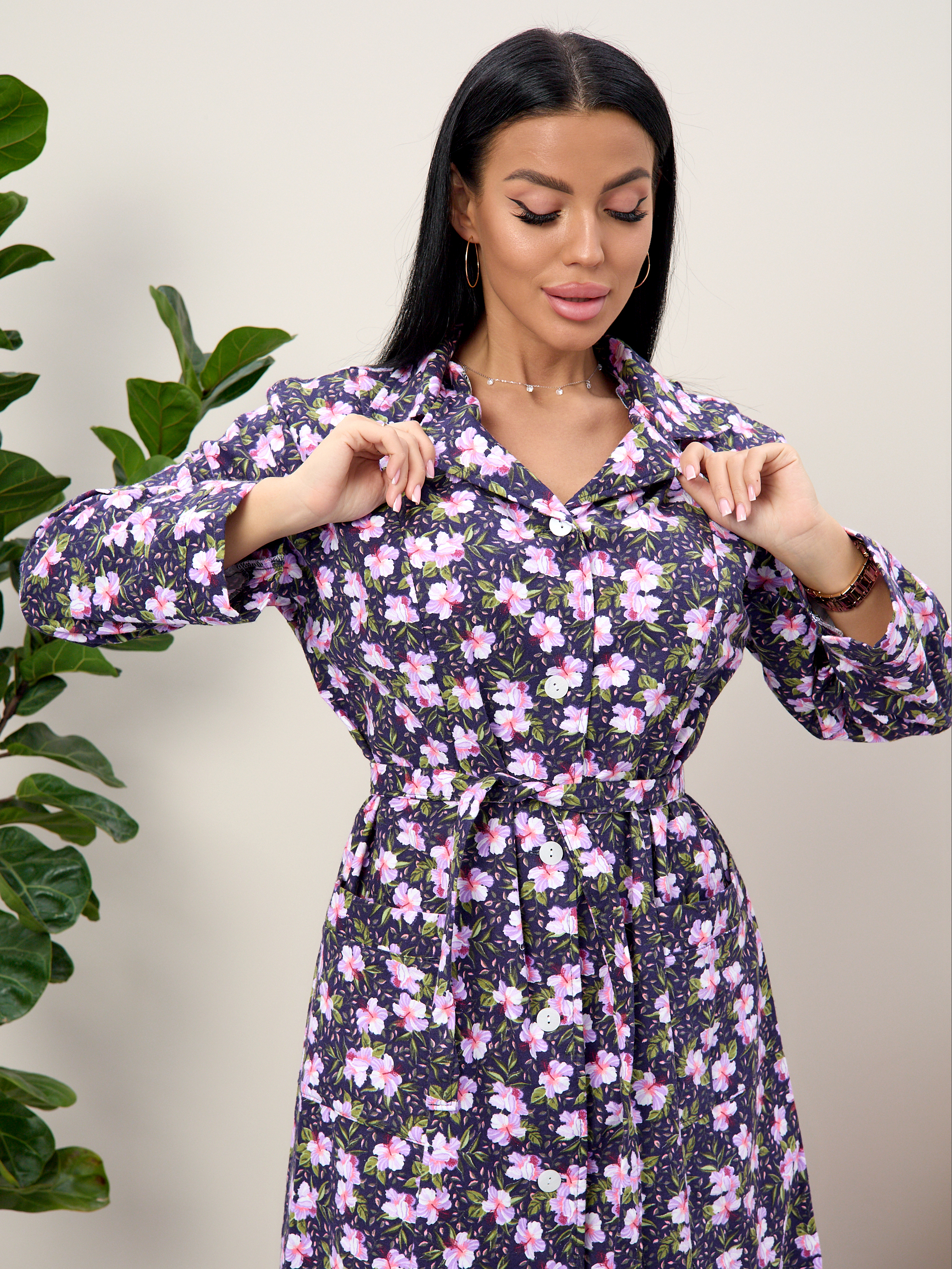 Халат прямой с рельефами, благодаря чему хорошо садится по фигуре, подчеркивая талию благодаря поясу.