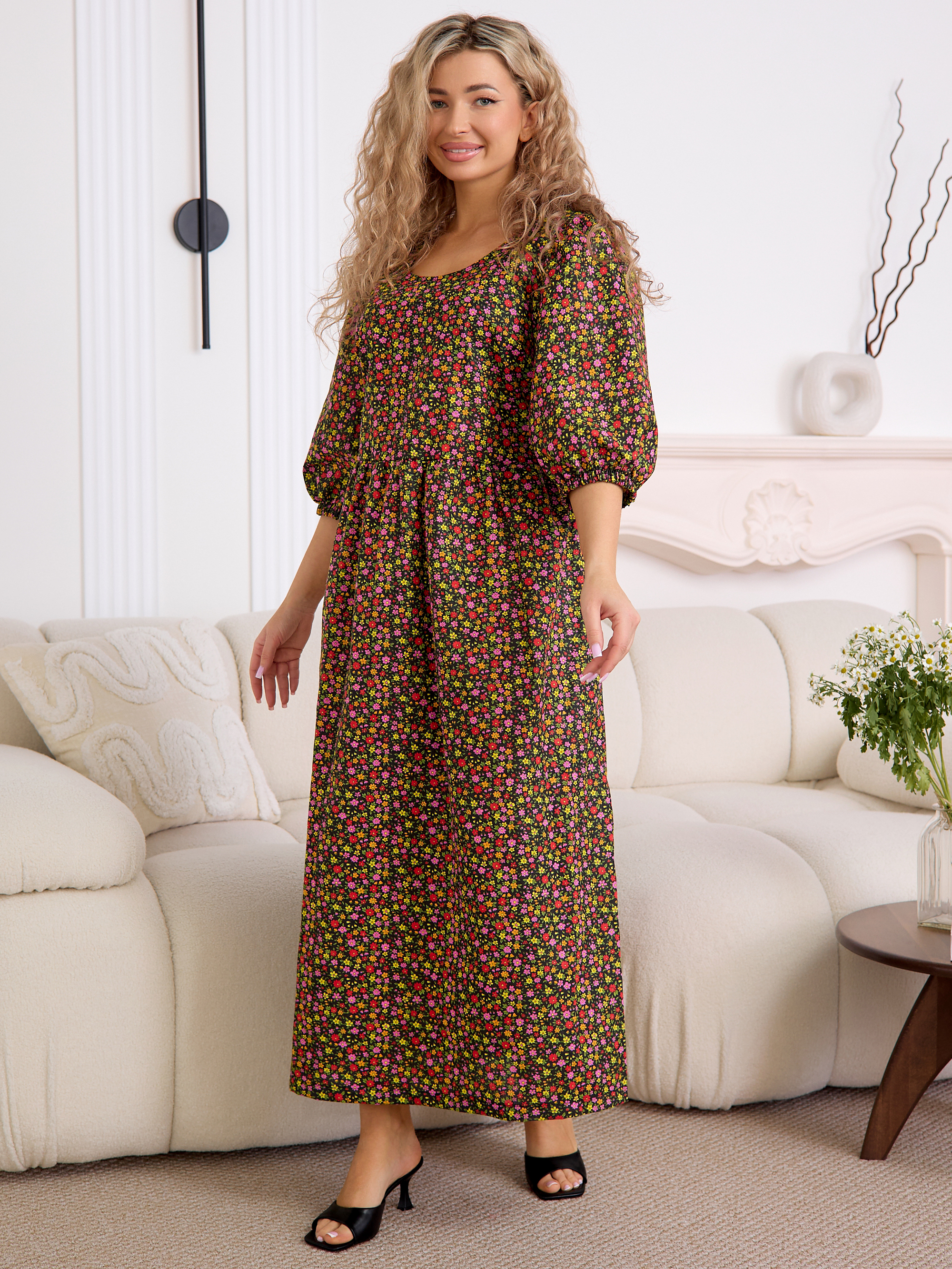 Рукав 3/4 с резинкой внизу — практичная и стильная деталь, которая завершает образ в духе «платья-крестьянки».